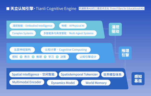 与传统AI插件式应用不同,天立学科大脑以认知计算为中枢,融合神经符号技术,将人类教育心理学先验知识与大模型超强推理能力深度对齐,构建了具备稳定情感底座与逻辑底座的类脑架构;通过高度模块化的认知接口,该架构实现了高并发、可扩展、稳定可靠的底层引擎能力—是破解当前教育大模型“有知识没逻辑、有输出没记忆”痛点的关键,通过管理记忆、执行逻辑推理、构建物理世界模型,对学习过程的深度理解、动态预测与精准干预,让教育AI真正从“对话交互”升级为 “任务执行”,支撑教育从经验驱动,全面走向数据驱动。