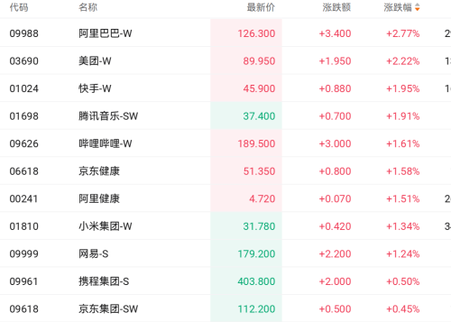 财联社4月10日讯(编辑 胡家荣)今日港股科技股早盘小幅上涨,其中阿里巴巴-W(09988.HK)领跑。截至发稿,阿里巴巴涨2.77%,快手-W(01024.HK)涨1.95%,网易-S(09999.HK)涨1.24%。
