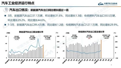 其中,新能源汽车3月出口37.1万辆,环比增长31.6%,同比增长1.3倍;传统燃料汽车3月出口50.5万辆,环比增长29.2%,同比增长44.6%。1—3月,新能源汽车出口95.4万辆,同比增长1.2倍;传统燃料汽车出口127.1万辆,同比增长29.9%。
