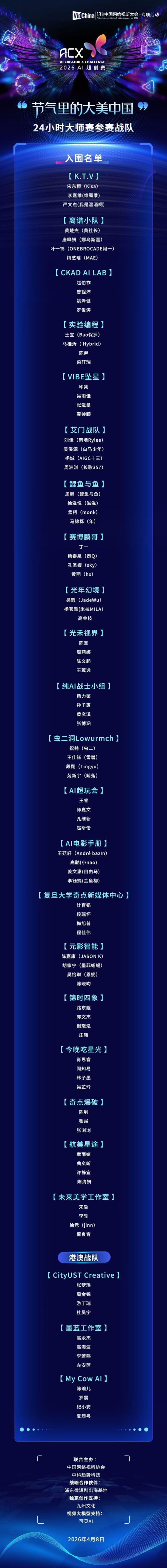 24支战队93名超级创作者集结!4月8日,第十三届中国网络视听大会创新活动“AI超创赛”(简称ACX)24小时大师赛入选战队名单正式公布。4月14日,成都、北京、香港、澳门四城将同步开赛,24支战队对应24个节气,在24小时内完成极限创作,呈现一场AI时代的“最强创力”!