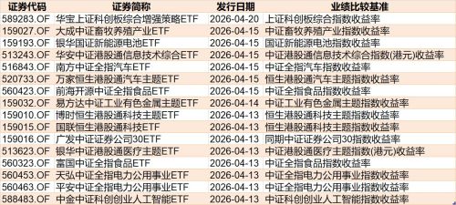 目前有15只ETF披露下周发行,跟踪标的为科创创业人工智能、电力、食品、港股通科技等。