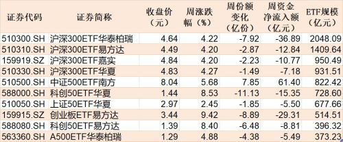 具体ETF方面,规模较大的10只宽基指数ETF本周合计净流出70.75亿元,其中中证500ETF南方净流入61.4亿元,沪深300ETF华泰柏瑞净流出36.89亿元。