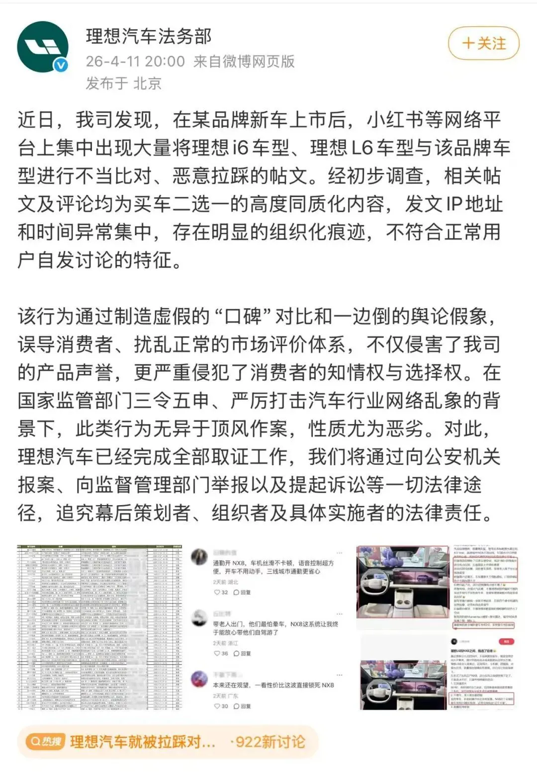 11日晚,理想法务部官微发布声明称,近日,公司发现,在某品牌新车上市后,小红书等网络平台上集中出现大量将理想i6车型、理想L6车型与该品牌车型进行不当比对、恶意拉踩的帖文。经初步调查,相关帖文及评论均为买车二选一的高度同质化内容,发文IP地址和时间异常集中,存在明显的组织化痕迹,不符合正常用户自发讨论的特征。