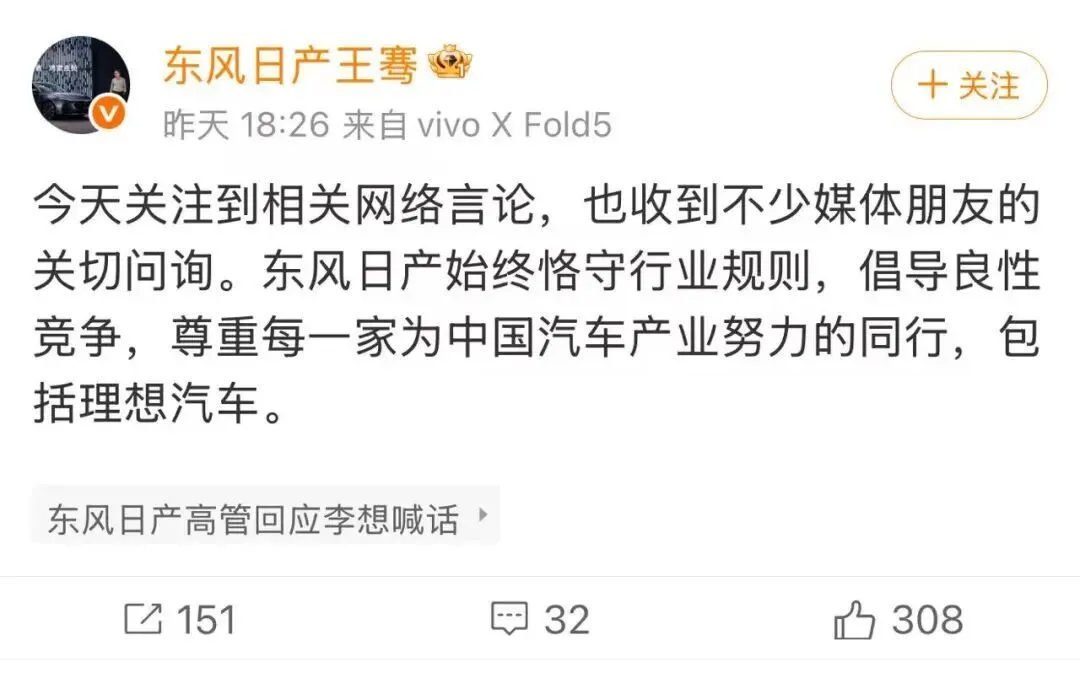 同日晚,东风日产汽车销售有限公司新能源品牌总经理王骞也在微博上发文称,今天关注到相关网络言论,也收到不少媒体朋友的关切问询。东风日产始终恪守行业规则,倡导良性竞争,尊重每一家为中国汽车产业努力的同行,包括理想汽车。