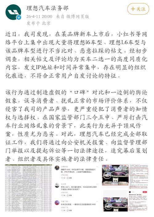 近日,我司发现,在某品牌新车上市后,小红书等网络平台上集中出现大量将理想i6车型、理想L6车型与该品牌车型进行不当比对、恶意拉踩的帖文。经初步调查,相关帖文及评论均为买车二选一的高度同质化内容,发文IP地址和时间异常集中,存在明显的组织化痕迹,不符合正常用户自发讨论的特征。