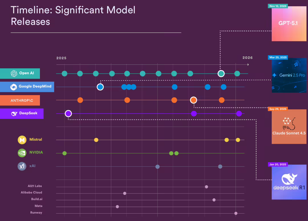 发布速度也在变态加速。光是 2026 年 2 月一个月,就有 Gemini 3.1 Pro、Claude Opus 4.6、GPT-5.3 Codex、Grok 4.20、Qwen 3.5、Seed 2.0 Pro、MiniMax M2.5、GLM-5 八九个旗舰模型同月入场。封神周期从「年」变成了「月」。