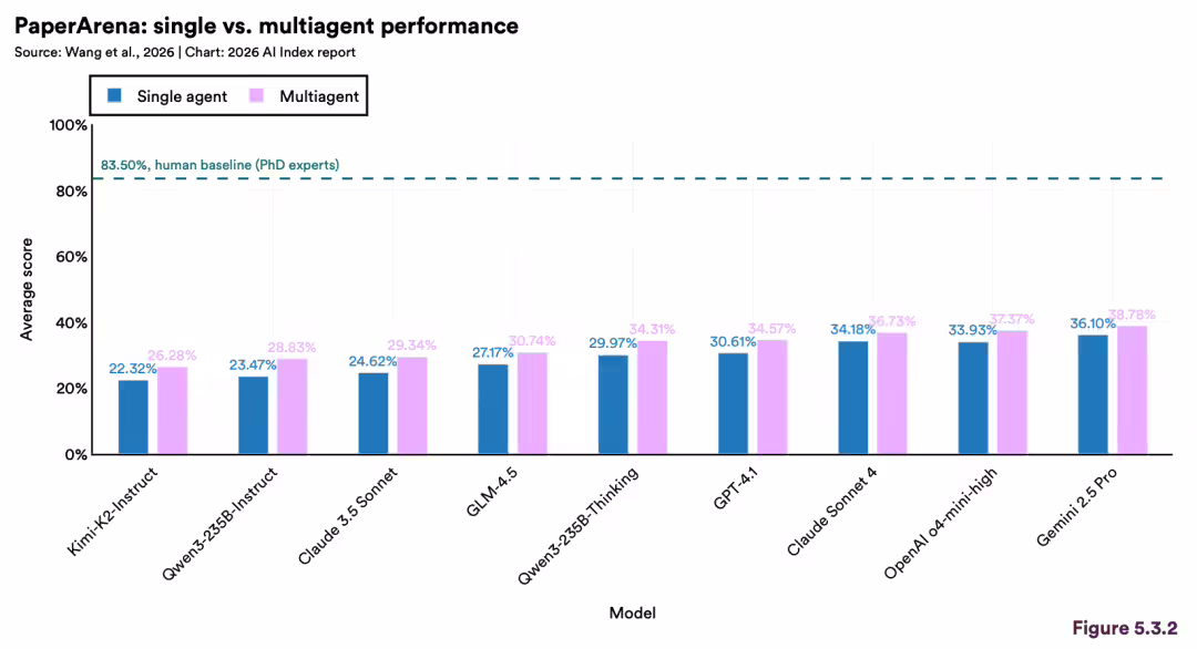 然而,在专门评估科研逻辑的 PaperArena 测试中,最强 AI 加持的 Agent,得分仅 39%,只有博士生一半的功力。