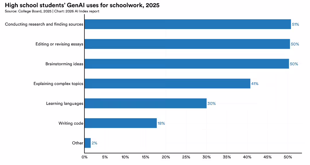 正规教育跟不上 AI 了。美国有 4/5 的高中生和大学生现在用 AI 完成学校作业。但只有一半的中学有 AI 使用政策,只有 6% 的老师认为这些政策写得清楚。