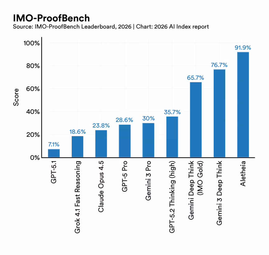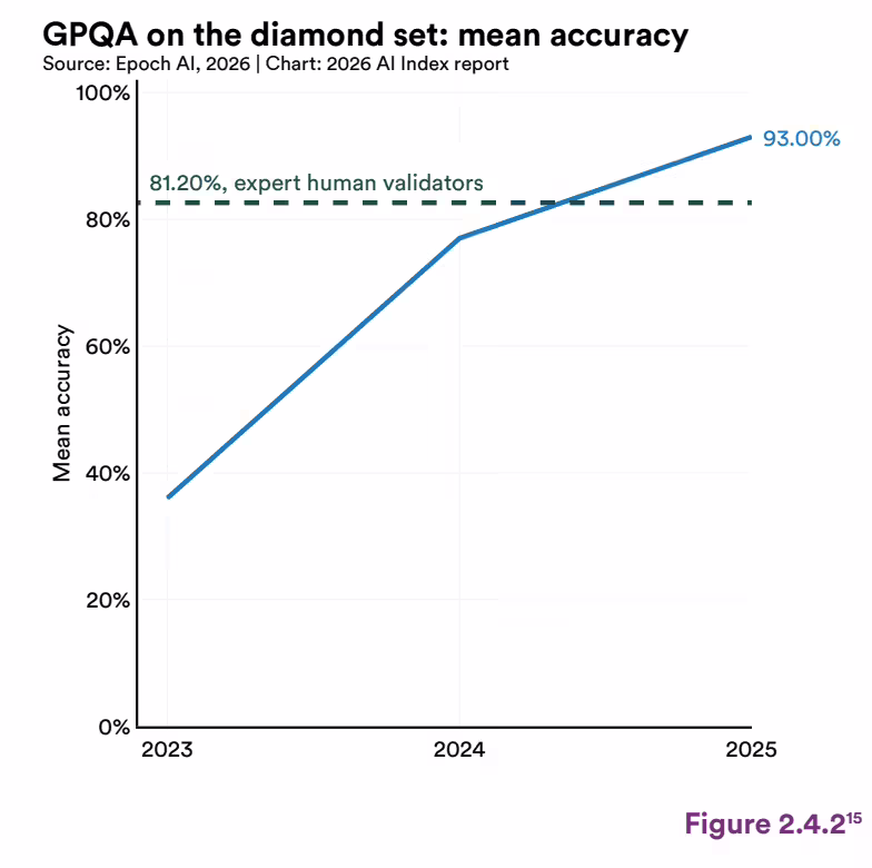 报告还指出,AI 的进化不仅没有遭遇所谓的「瓶颈」,反而正以史无前例的速度狂飙。过去一年,全球超 90% 的顶尖模型,在博士级科学问题、多模态推理、竞赛数学上的表现,追平甚至超越了人类。
