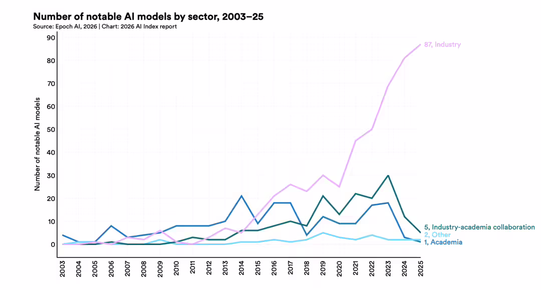 去年发布的 95 个最具代表性的模型里,超过九成都来自产业界,不是学术机构,也不是政府实验室。学术界已经追不上前沿了。