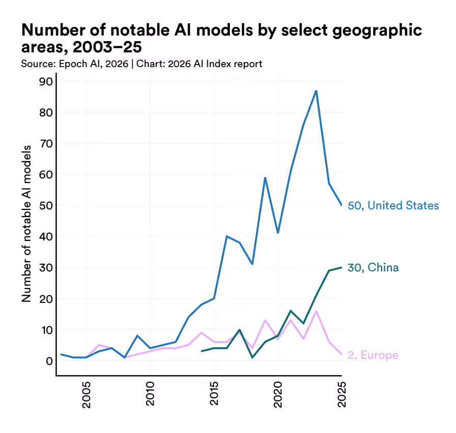 数量上同样接近五五开。2025 年美国发布了 50 个「显著模型」,中国紧跟着也发布了 30 个顶尖大模型。