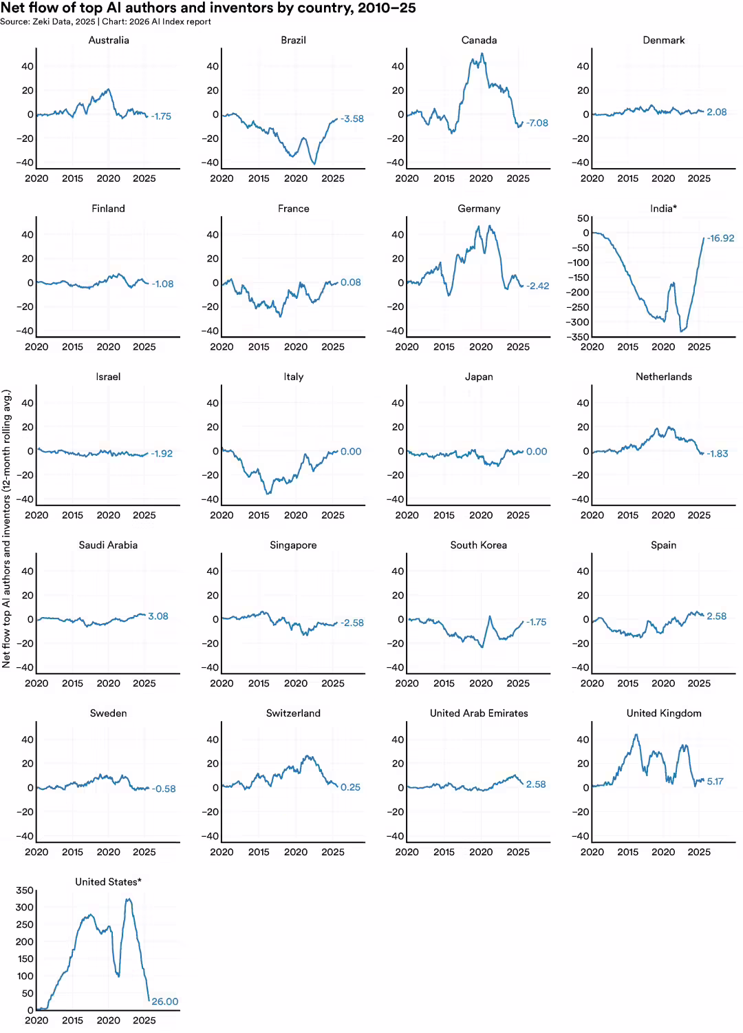 美国仍然是全球 AI 研究人员密度最高的国家,但流入的水龙头正在拧紧。钱和人这两条曲线开始反向。这是过去十年没出现过的局面。