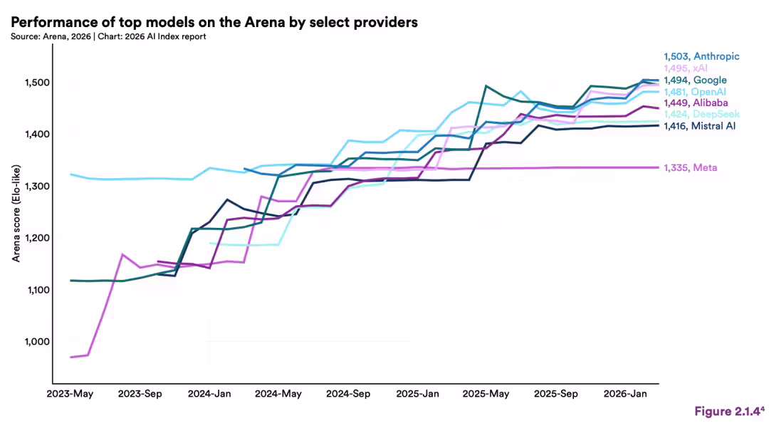 其中,最震撼的结论是 —— 中美 AI 模型性能差距已基本消失,双方在巅峰对决中频繁易主,目前 Anthropic 领先优势仅剩 2.7%。