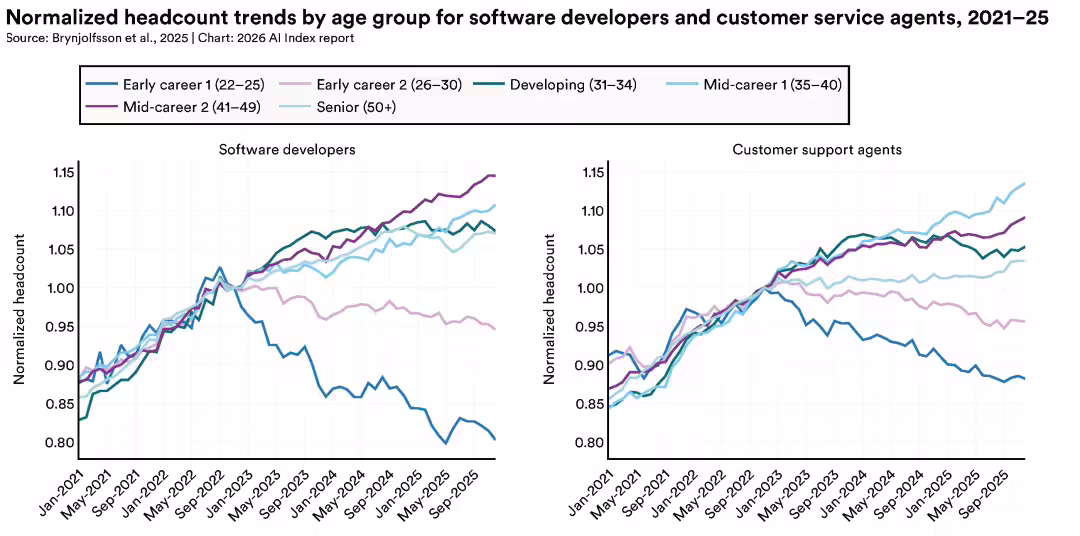 整份 AI Index 里最让中文读者沉默的,可能是关于年轻就业的部分。22 到 25 岁的软件开发者群体,从 2024 年至今,就业人数下降了大约 20%。同期,年纪更大的同行群体反而在增长。