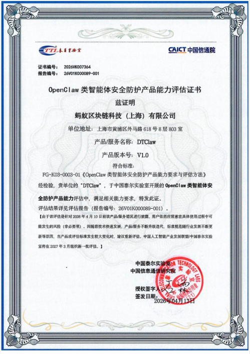 近日,中国信通院正式启动“OpenClaw类智能体安全防护产品能力评测”,聚焦基础环境安全、权限与数据安全、应用安全三大维度,对当前热门的“龙虾”类AI智能体产品展开系统性安全检验。蚂蚁数科旗下AI智能体平台DTClaw凭借全链路安全防护能力,顺利通过全部测评项,成为国内首批通过该评测的产品。