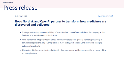 两家公司的试点项目将覆盖研发、生产制造及商业运营领域,计划于2026年底前完成全面整合。诺和诺德还表示,OpenAI还将协助培训其全球员工队伍,提升AI素养,增强各部门生产力。